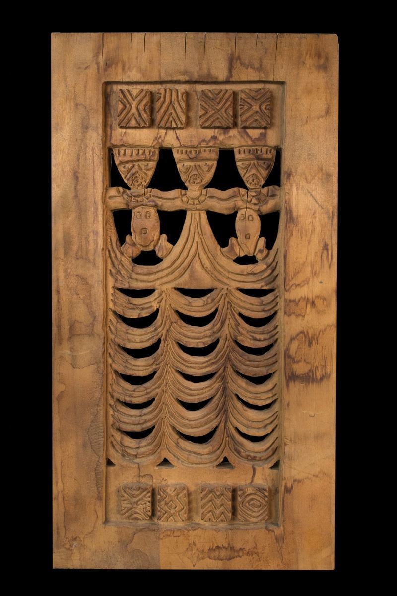 (1950s) An early hanging panel with figural Tongan tiki motifs. Used for room screens. Possibly the master pattern.29"x15.5".VG+