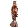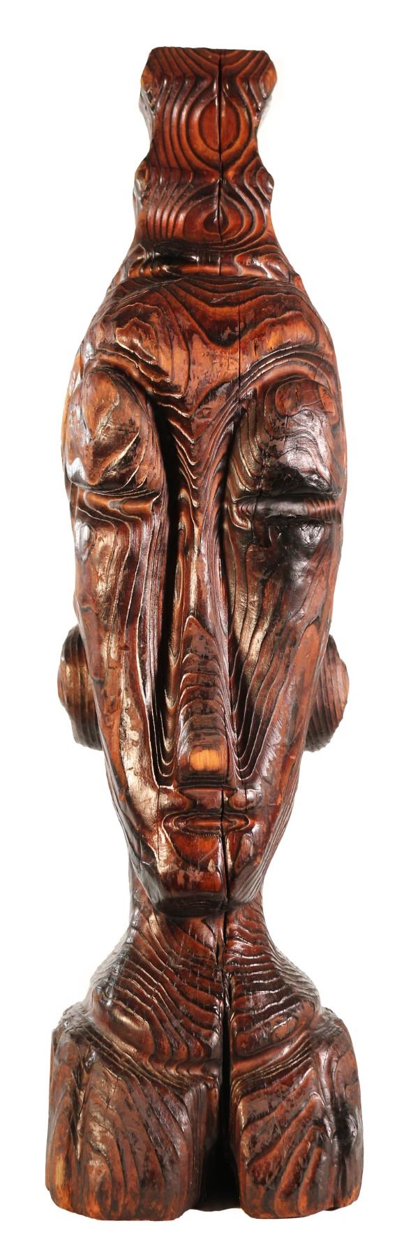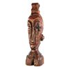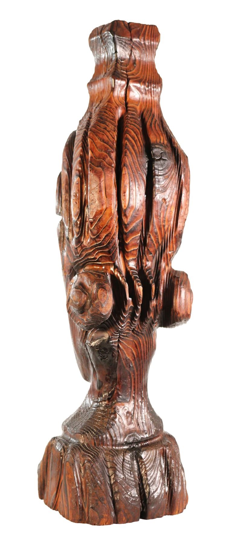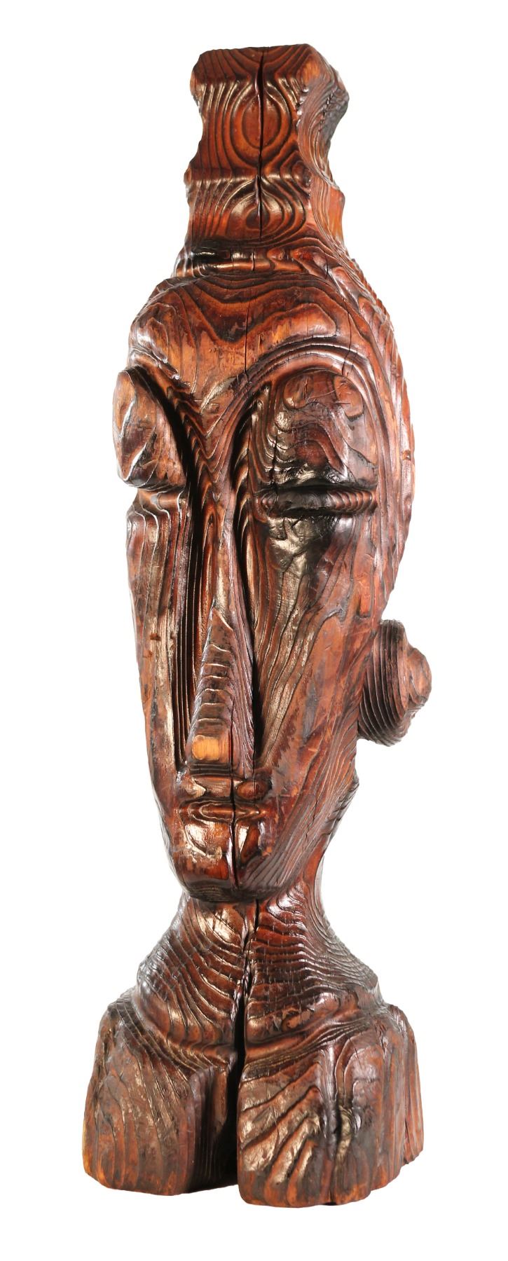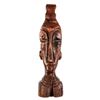 (1960s) Beautiful dark wood with deep natural wood grains enhance the depth of this unique Tiki head. Elongated nose with high headdress. An early WITCO offering. Solid wood on base. 28"x7.75"x7.5". VG+ natural wood split that is part of the design.