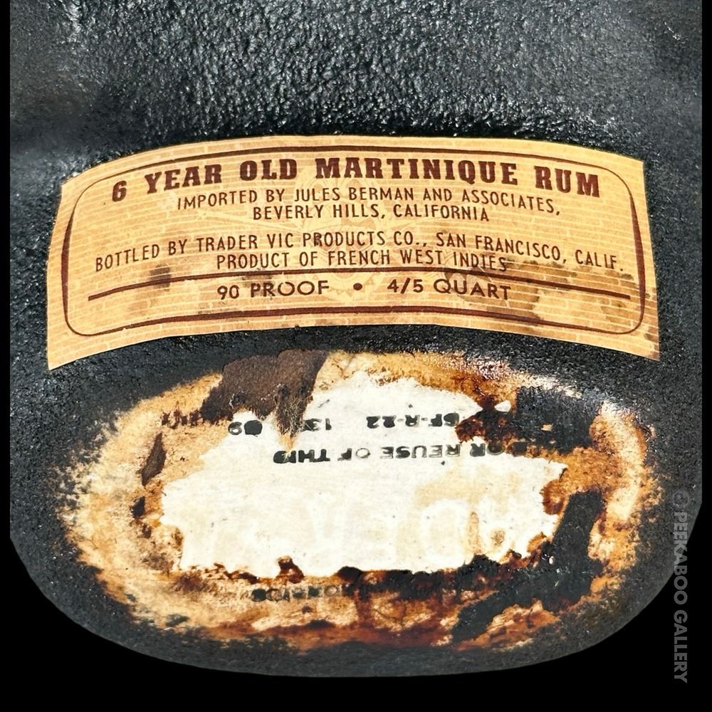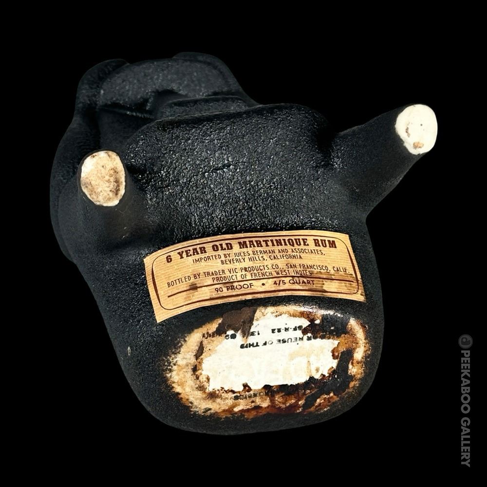 (1950s) Second version of the Suffering Bastard Martinique Rum decanter produced by Trader Vic's.This particular decanter is the more refined version with a paper rum label still present on the underside. VG+ with minor wear. Partial cork intact. 9.25"x4.75"x4.75".