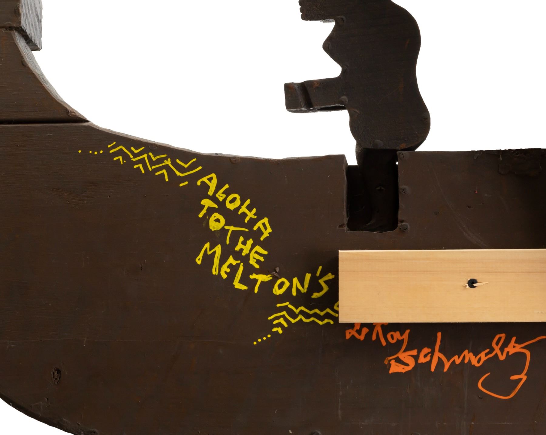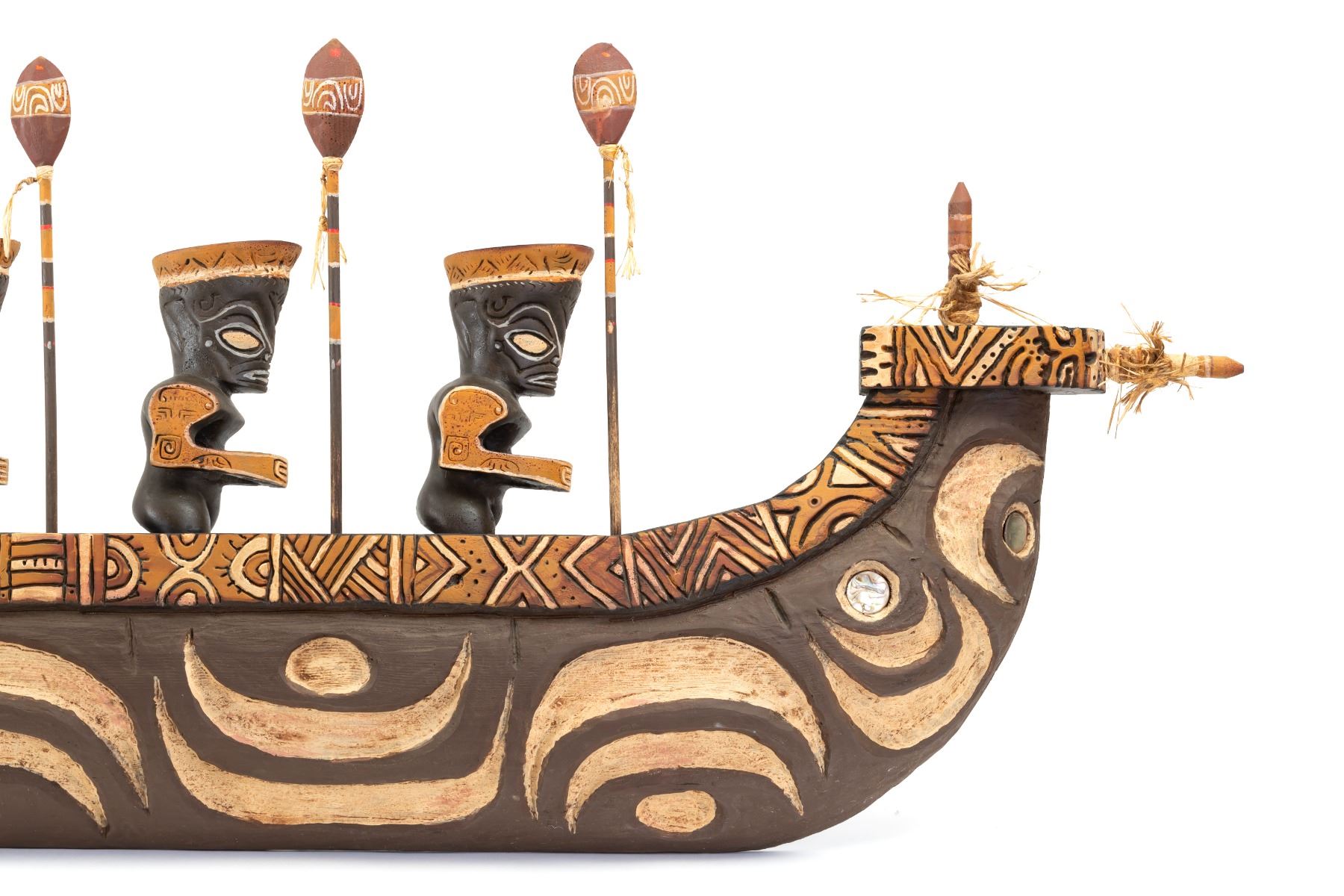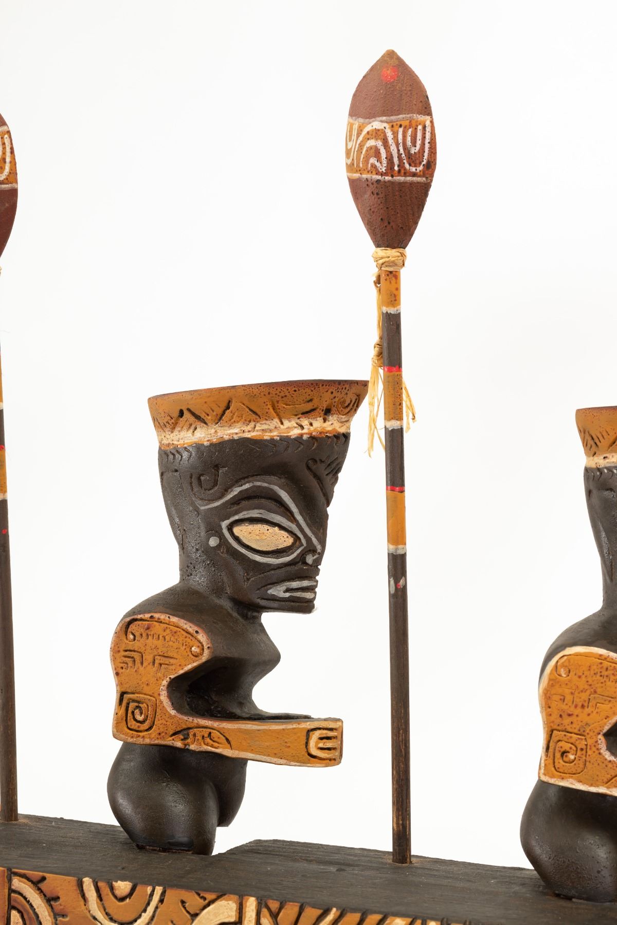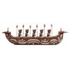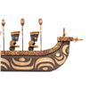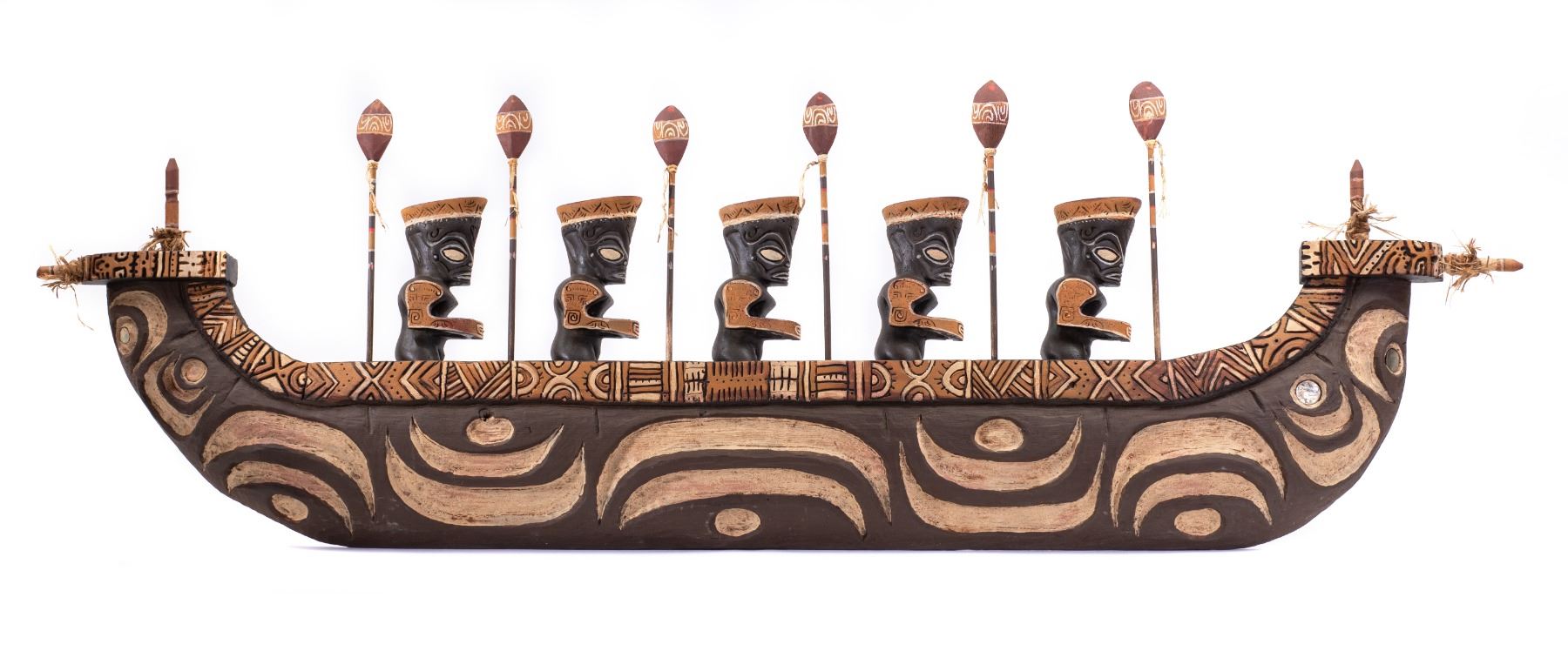 (1990) One of the prize pieces from the workshop of famed Polynesian Pop carver, LeRoy E. Schmaltz. These Polynesian War Canoes with five war club-weilding Marquesan warriors on board is surely one of the most elaborate creations to come from OA. Although this wasn't officially an OA catalog item, a handful of these have been created over the years. The labor and materials involved kept these to only being created by hand and no two were alike. According to LeRoy, only a couple dozen were made in his 65+ year career. Beautiful craftsmanship in concept and design. The epitome of Poly-Pop decor. Enhanced with bits of raffia ties on spears and boat ends. Hand painted. Solid wood. Signed and personalized by LeRoy Schmaltz. *Special shipping considerations on this oversized artifact. 80"x23". VG+.