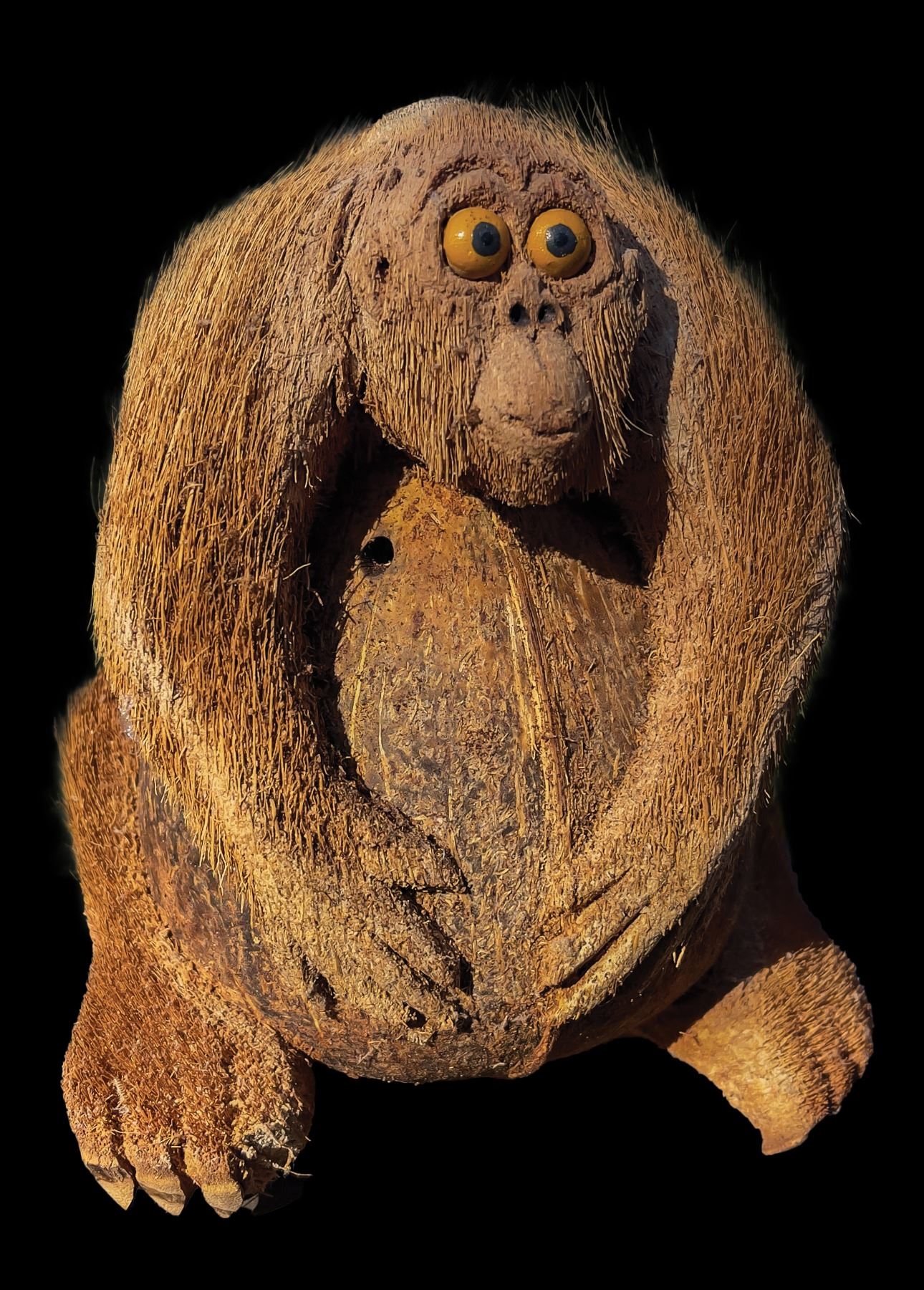 (1970s) A very clever carving of the traditional coconut monkey novelty figure. The expression and use of the coconut fiber as fur is unusual. 7.25"x6"x6". VG+ with typical wear.