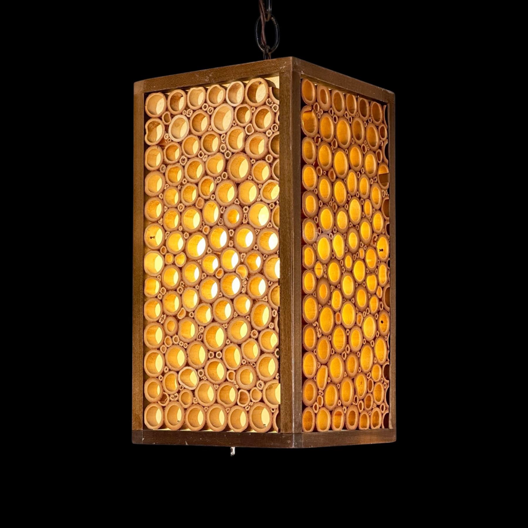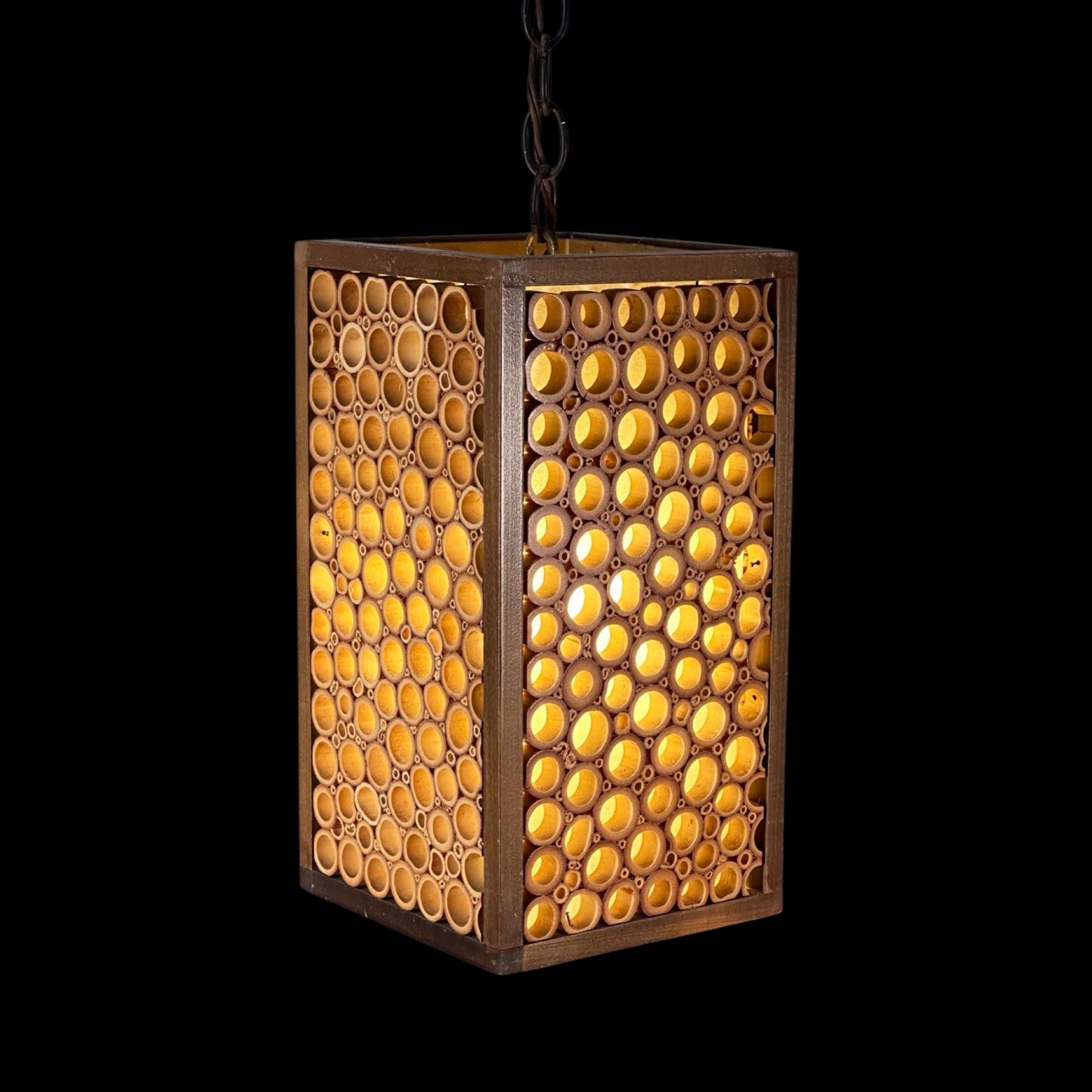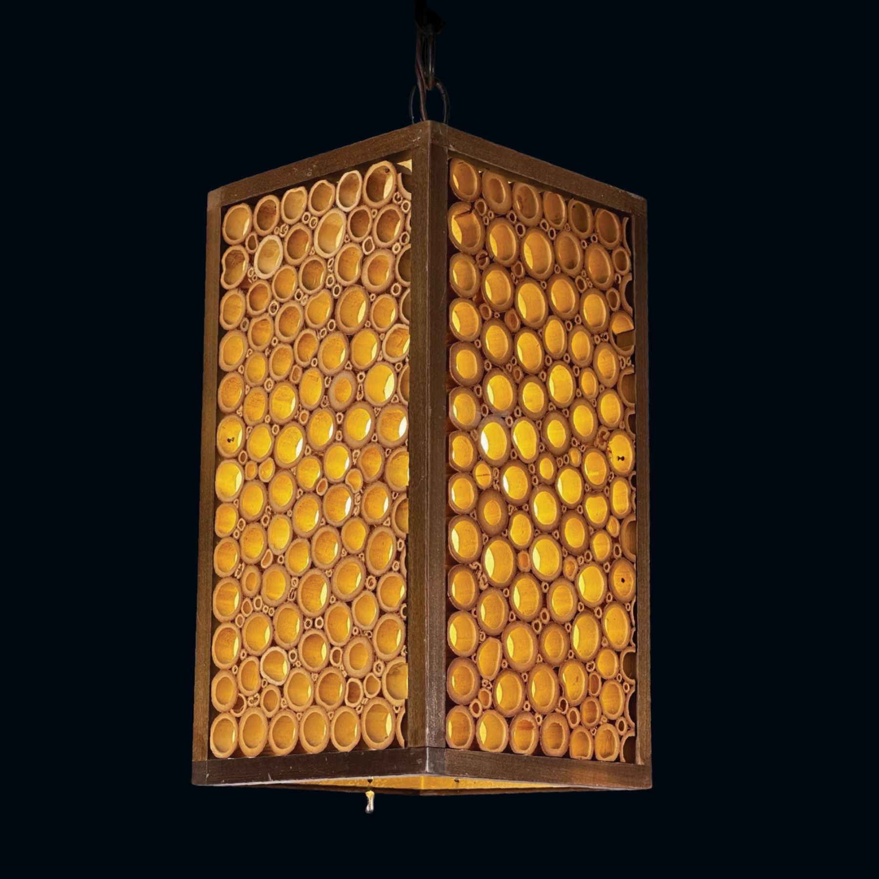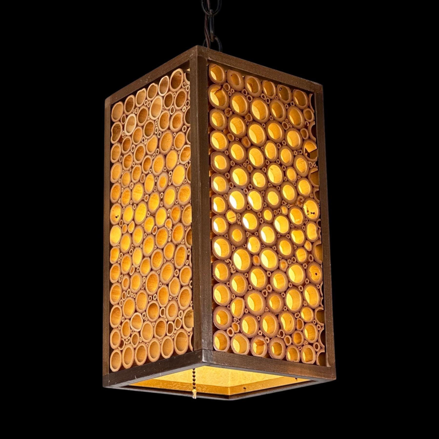 (1970s)* Bought by Sven at the original EXOTICAL shop in Downey. EXOTICAL was (and is!) a Hawaiian apparel shop that also sold home furnishings. It was established in 1964 and still operates to this day. This wonderful bamboo lamp hung in his den for years. VG+ with typical wear. 6.75"x12.75"x6.75".