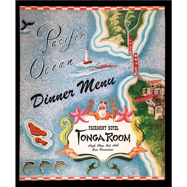 (1960s)* Dinner menu for the Long Beach, CA restaurant. VG+ with light creasing and corner pin holes. 9.5"x13" closed.