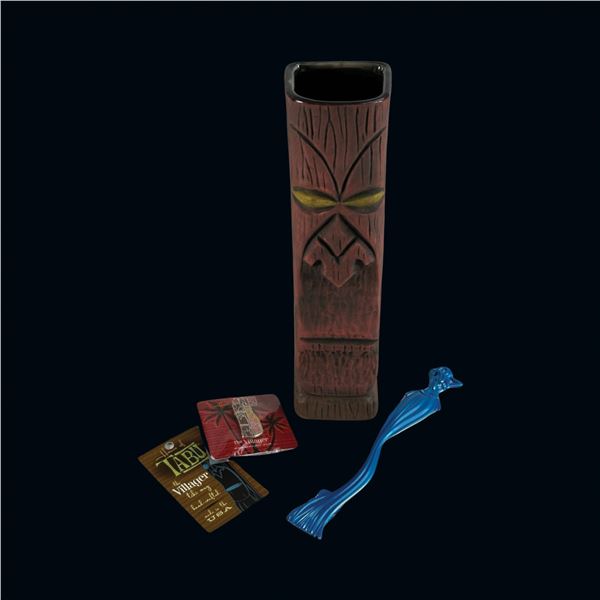 HOUSE OF TABU "THE VILLAGER" TIKI MUG w/ HANG-TAG, AD CARD, SWIZZLE, & PIN IN ORIGINAL BOX.907 - HOUSE OF TABU "THE VILLAGER" TIKI MUG w/ HANG-TAG, AD CARD, SWIZZLE, & PIN IN ORIGINAL BOX.