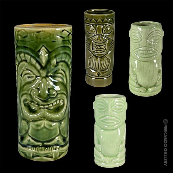 ORCHIDS OF HAWAII GREEN TIKI MUG SET of FOUR (4) - GREEN TWO-FACED TIKI, SMILING TIKI & TWO (2) MINT