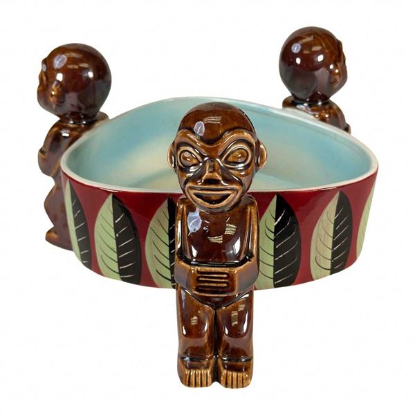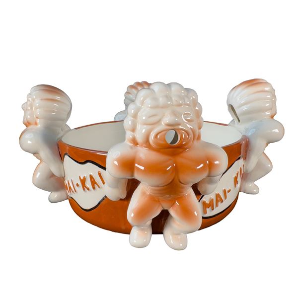 (1970s) Perhaps no vessel encompases the fun and fantasy of the Polynesian Pop era more than the MAI-KAI Mystery Bowl! The pomp and circumstance prese