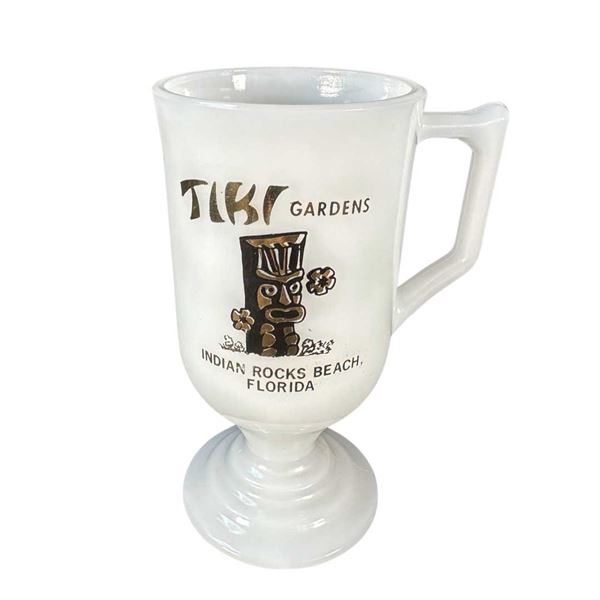 (1960s) Any glassware from the mythic venue of TIKI GARDENS in St. Petersburg, Florida are rare. Here is a handsome hot beverage mug with terrific gra