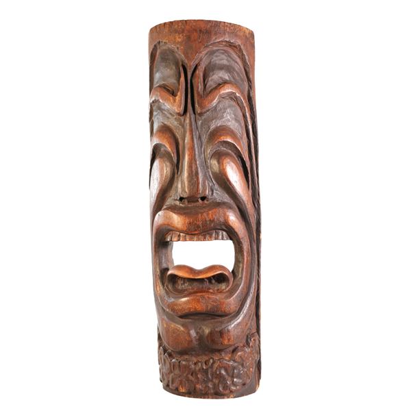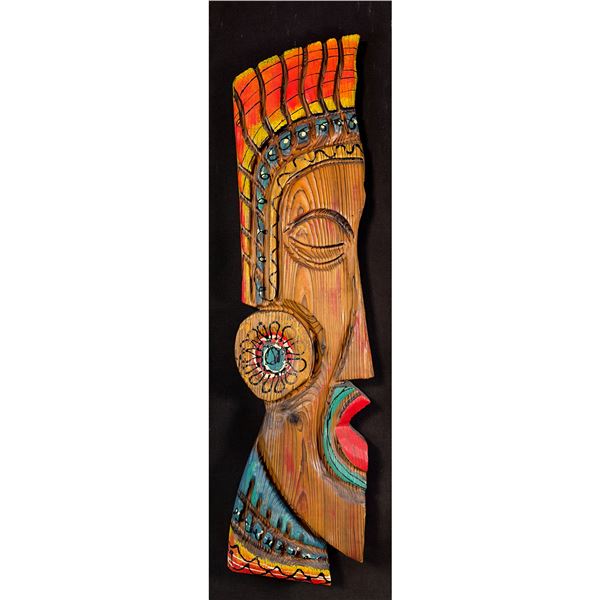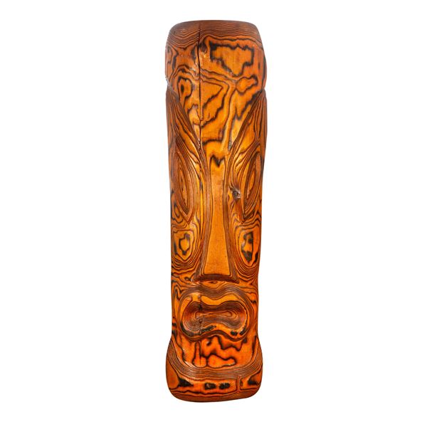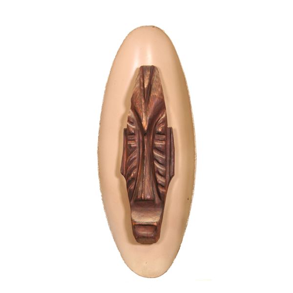 (1950s) An inventive, creative take on the Tiki mask. This hand carved item evokes a modernistic approach to the standard Tiki, featuring typical desi