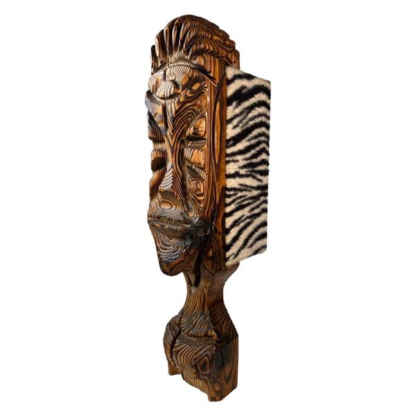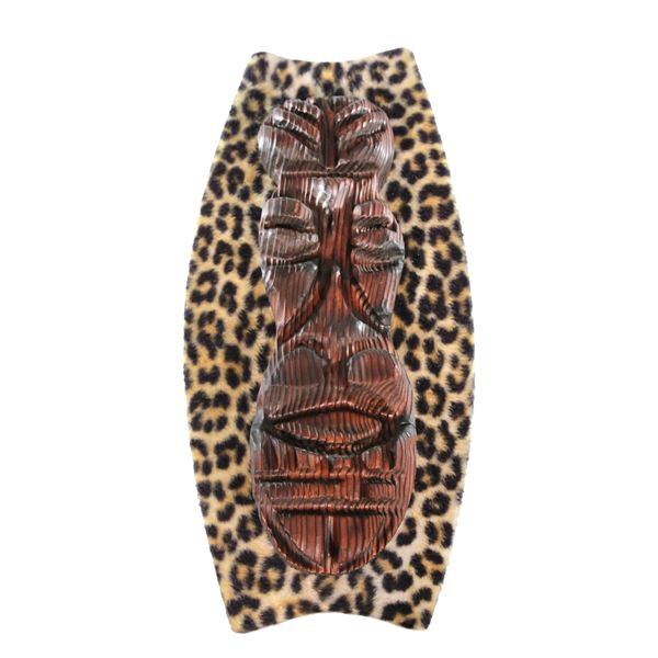CARVED WITCO TIKI MASK ON LEOPARD PRINT FAUX FUR.474 - CARVED WITCO TIKI MASK ON LEOPARD PRINT FAUX FUR.