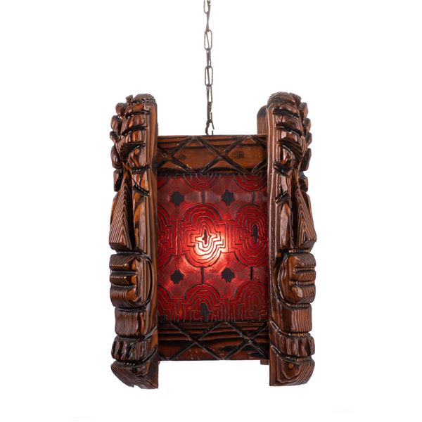 (1950s) Captivating image in the tradition of WITCO, this early catalog offering Tiki features enhanced burned wood grain. Solid wood. 31.25"x5...