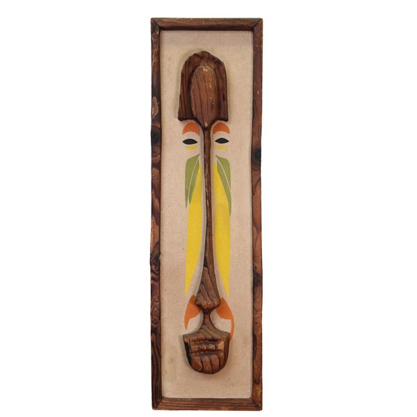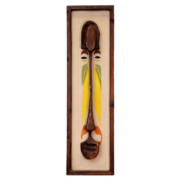 (1960s) Original wall art from the Western International Trading Co. (WITCO) features an unusual hand carved and painted mask .Using colors of yellow,