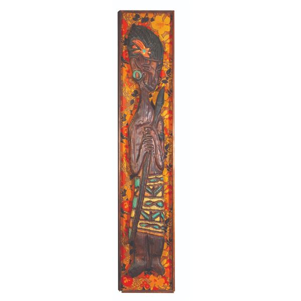 (1960s) Rare WITCO original wall hanging. Cedar wood hand-carved and painted Polynesian female topless with floral sarong skirt. A rare and powerful i