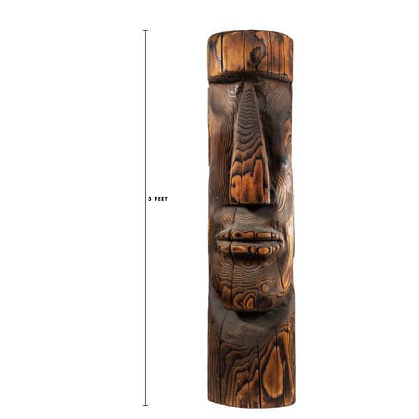 (2000s) Expertly handcrafted Tiki statue features a stoic guardian made of burned grain wood with sophisticated detail. Light grain enhances the facia