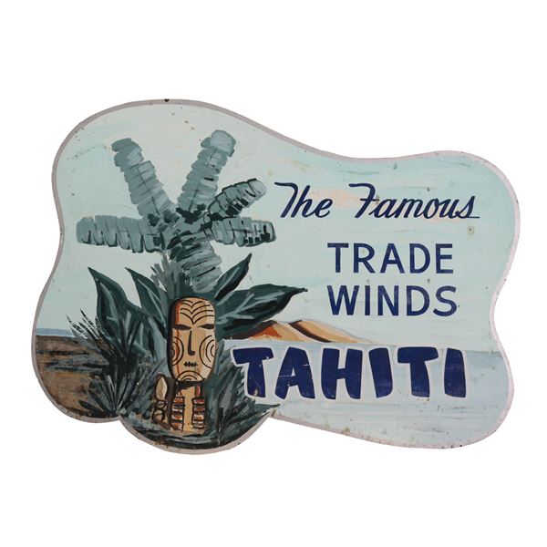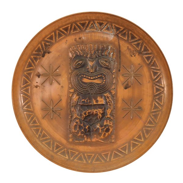 (1960s) Burnished bronze colored plastic tray features Hawaiian Tiki god KU imprinted in black and encircled with black tribal pattern. Plastic.14&q...