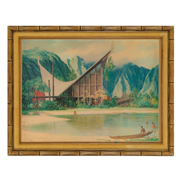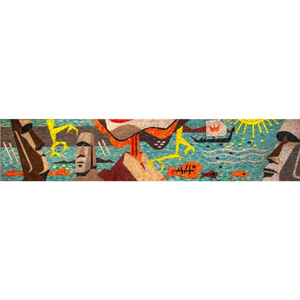 (1950S) The Holy Grail of Poly-Pop decor! A dazzling work of art with this jaw-dropping mosaic depicting Moai tiki statues against an active volcano a