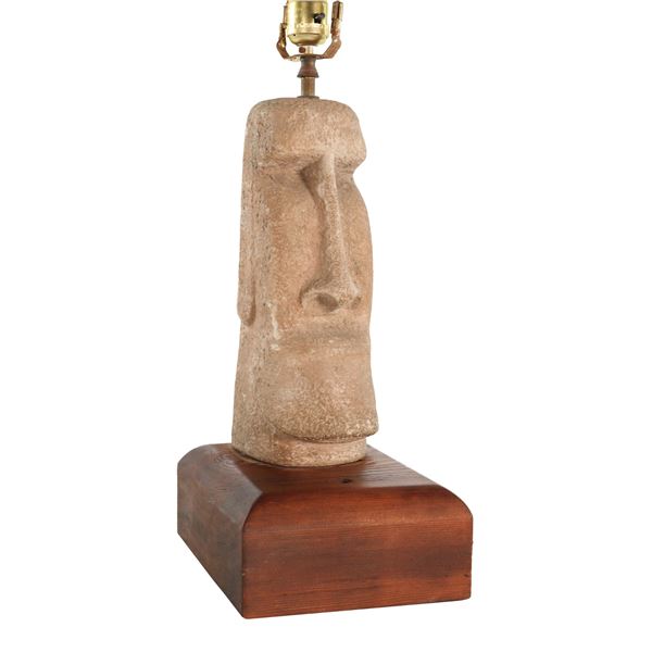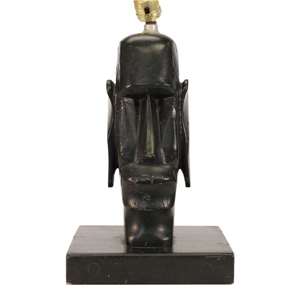 (1960s) Impressive Moai Tiki table lamp carved with unvarnished, raw palm wood, which adds a seductive texture to the piece. The carving is reminiscen
