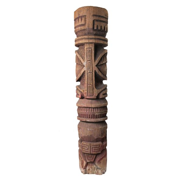 (1960s) Hand carved Marquesan Tiki idol features traditional tattoo symbols and face design intricately carved into it. Solid wood. 12.5"x4.5&q...