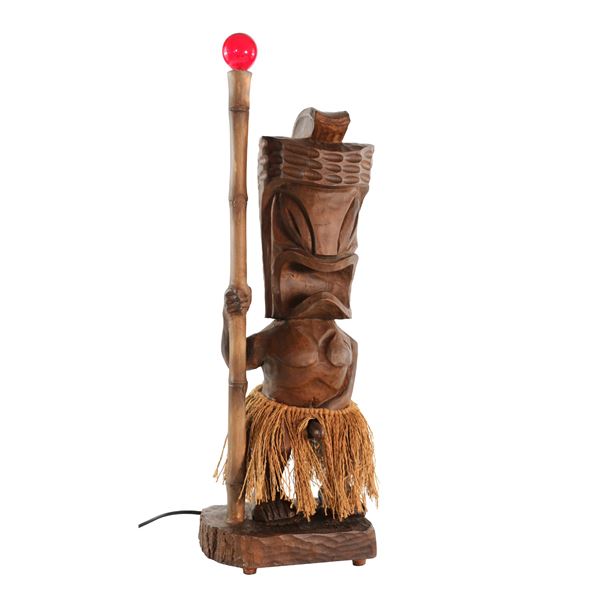 (2006). "Hold my ...spear"? This whimsical, hand carved Tiki table lamp by Geckoz features a red bulb atop the spear and full raffia grass...