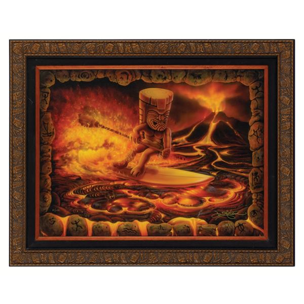 (2015) Totally cool painting of something so hot! Hand painted image of a Tiki idol surfing among the flaming lava of a volcano pit. Amazing border of