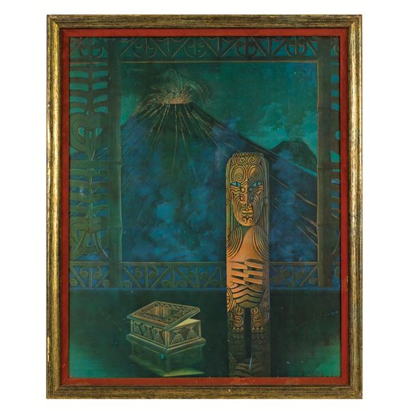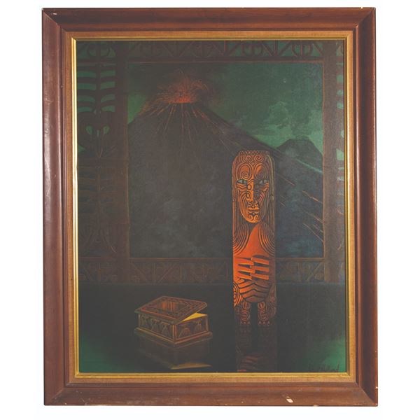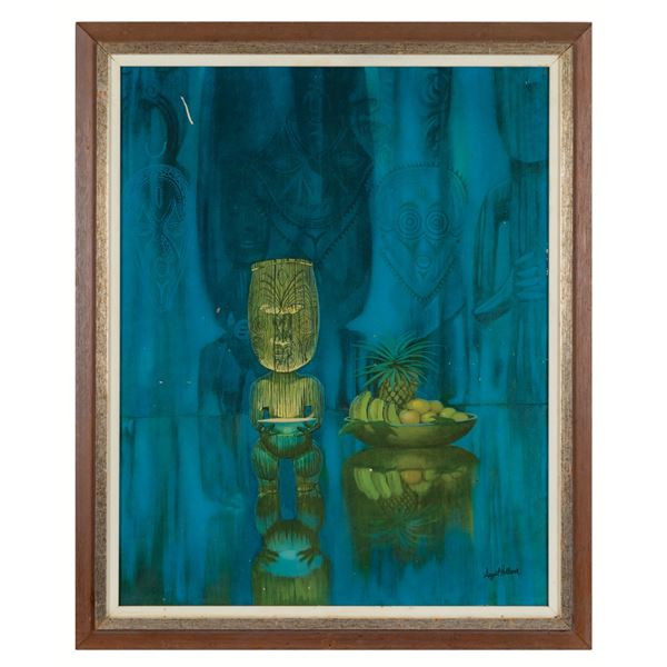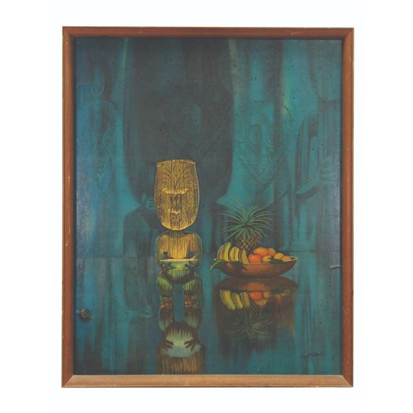 PAINTING OF TIKI WITH FRUIT BOWL BY AUGUST HOLLAND.