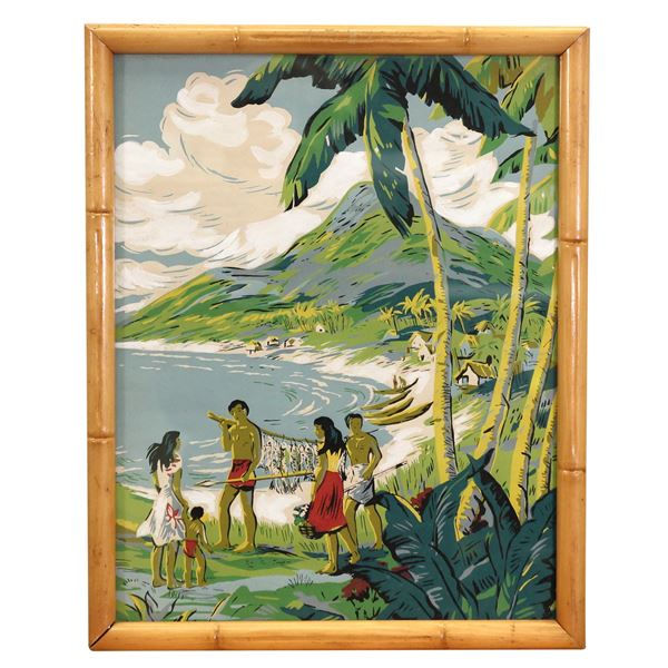 STUNNING 1940s HAWAIIAN LINOLEUM BLOCK OF FISHERMAN RETURNING WITH THEIR CATCH.