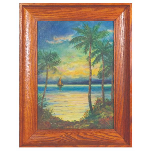 (1954). Alluring vintage oil on canvas image of a sailboat drifting away from a tropical island toward a golden sunset. A gorgeous subject and keyston