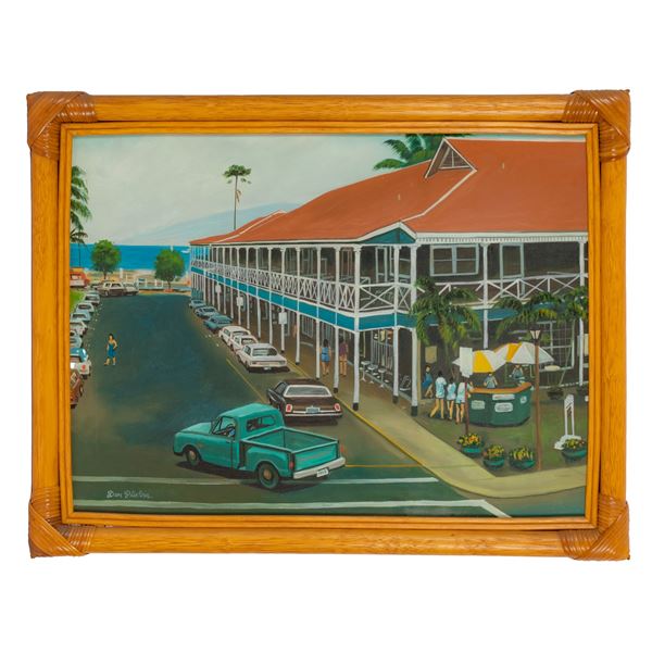 PAINTING OF MOLOKAI ISLAND HAWAIIAN BEACH TOWN.