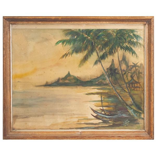 LOVELY WATERCOLOR PAINTING OF CATAMARAN UNDER HAWAIIAN PALMS SIGNED JOHN SEVILLE.