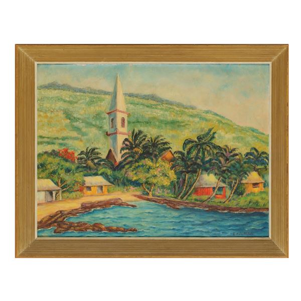 (1950s) The charm and tranquility of a shoreline on Molokai features a high church steeple nestled behind lush tropical palm and deep blue tranquil wa