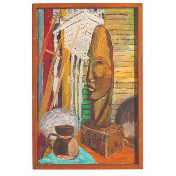 (1950s) Amateur abstract still life a primitive scene with Tiki idol. 12"x18". VG+ with typical wear. Frame worn.