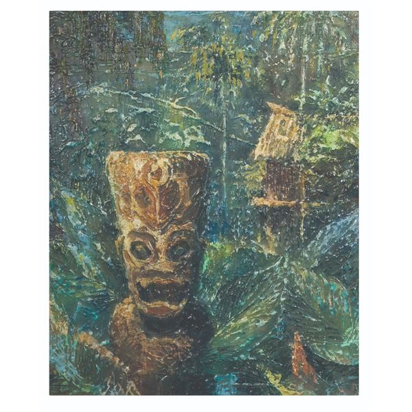 (1950s) The painted texture and outrageous interpretation of a howling Tiki idol are the standout features of this painting. Highly original and excel