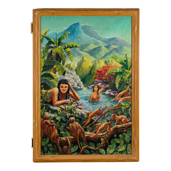 PAINTING OF PLAYFUL MONKEYS AND WAHINES IN LAGOON from the WOLF'S LAIR ESTATE.