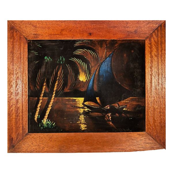 PAINTING OF SAILBOAT AND PALM TREES ON BLACK VELVET.