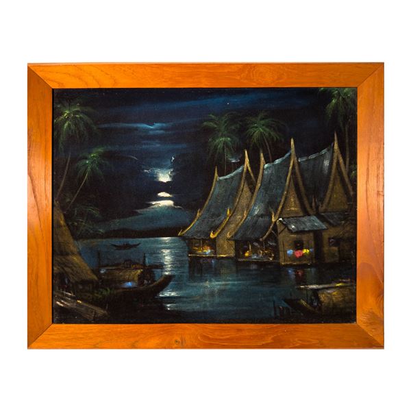 (1960s) Just a hint of tropical surrealism as the huts depicted in this painting seem to be floating atop the waters. Wonderful blue moon reflecting o