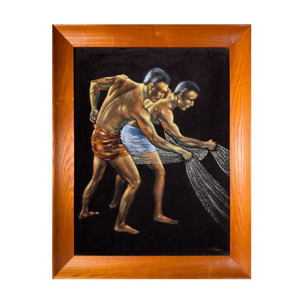 (1950s) The toned and chiseled musculature of these near-identical males casting their net is the focal point of this interpretation of tropical islan