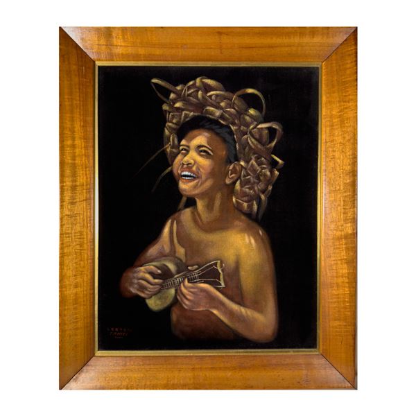 PAINTING OF MAN PLAYING UKULELE ON BLACK VELVET TITLED "BEACH BOY" SIGNED LEETEG TAHITI (COPY).