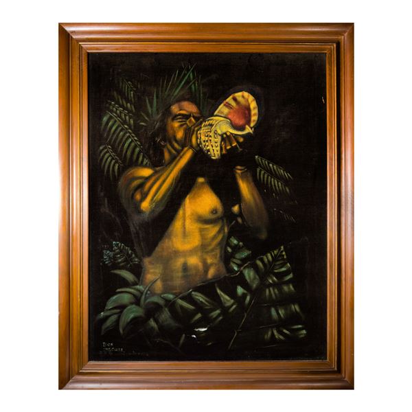 PAINTING OF WARRIOR BLOWING CONCH ON VELVET BY DON MCGUIRE.