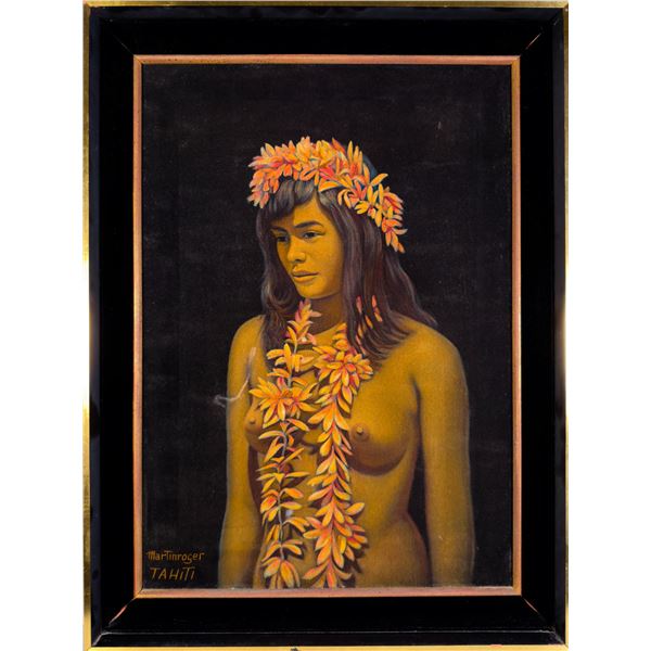 PAINTING OF SEMI-NUDE NATIVE WOMAN ON BLACK VELVET SIGNED MARTIN ROGER,TAHITI.