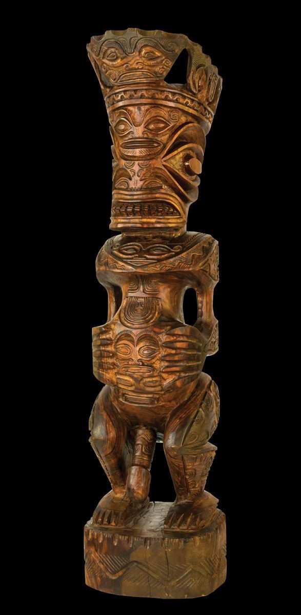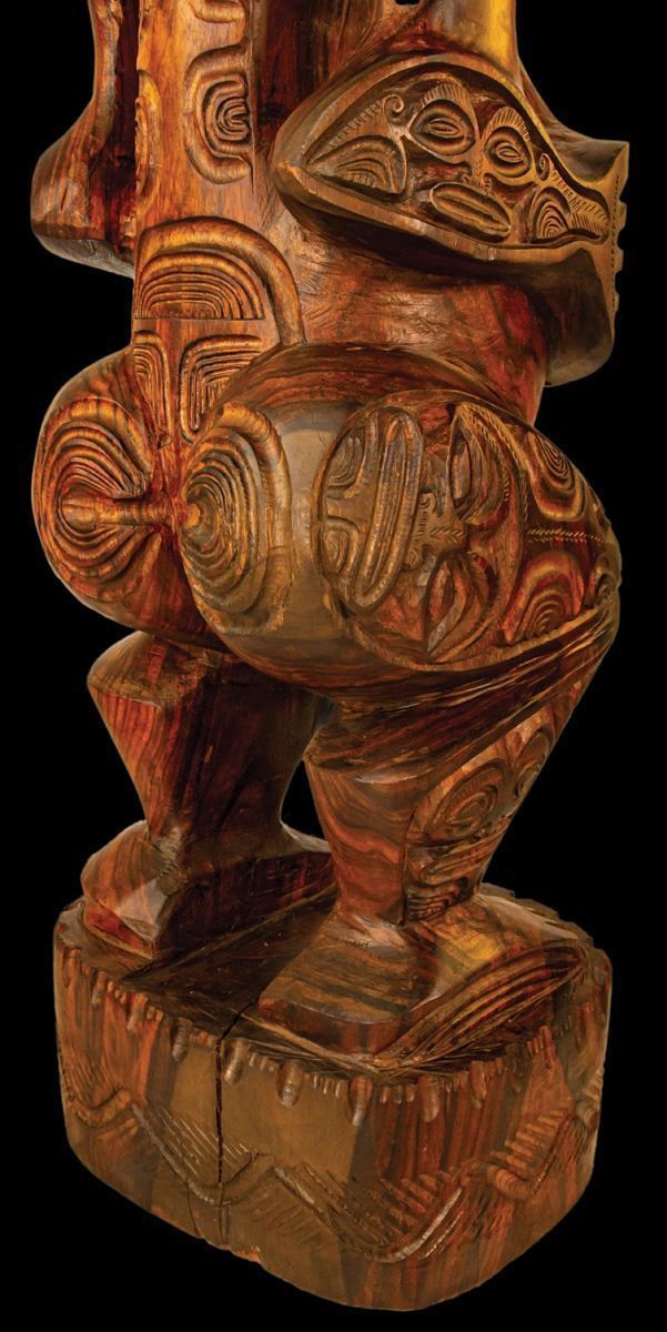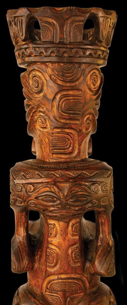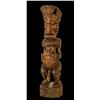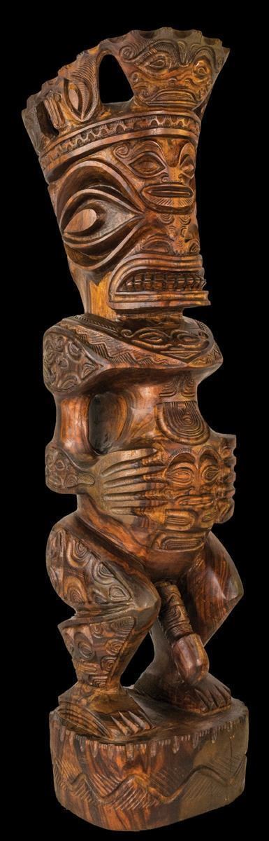 (Mid-Century) Certainly one of the jewels of the OA Primitive Arts Collection. This piece must be seen in person to truly appreciate it’s impressive beauty. Vigorously carved king or royal figure wearing a crown, seen with open mouth and exposed teeth, projecting great power and tension. Various detailed tiki faces on the head, crown and body. Phallus detaches. A transitional sculpture made by a skilled artist. Unusually large, PLEASE NOTE THE SIZE.40"x 9"x 9".VG+ with typical wear .