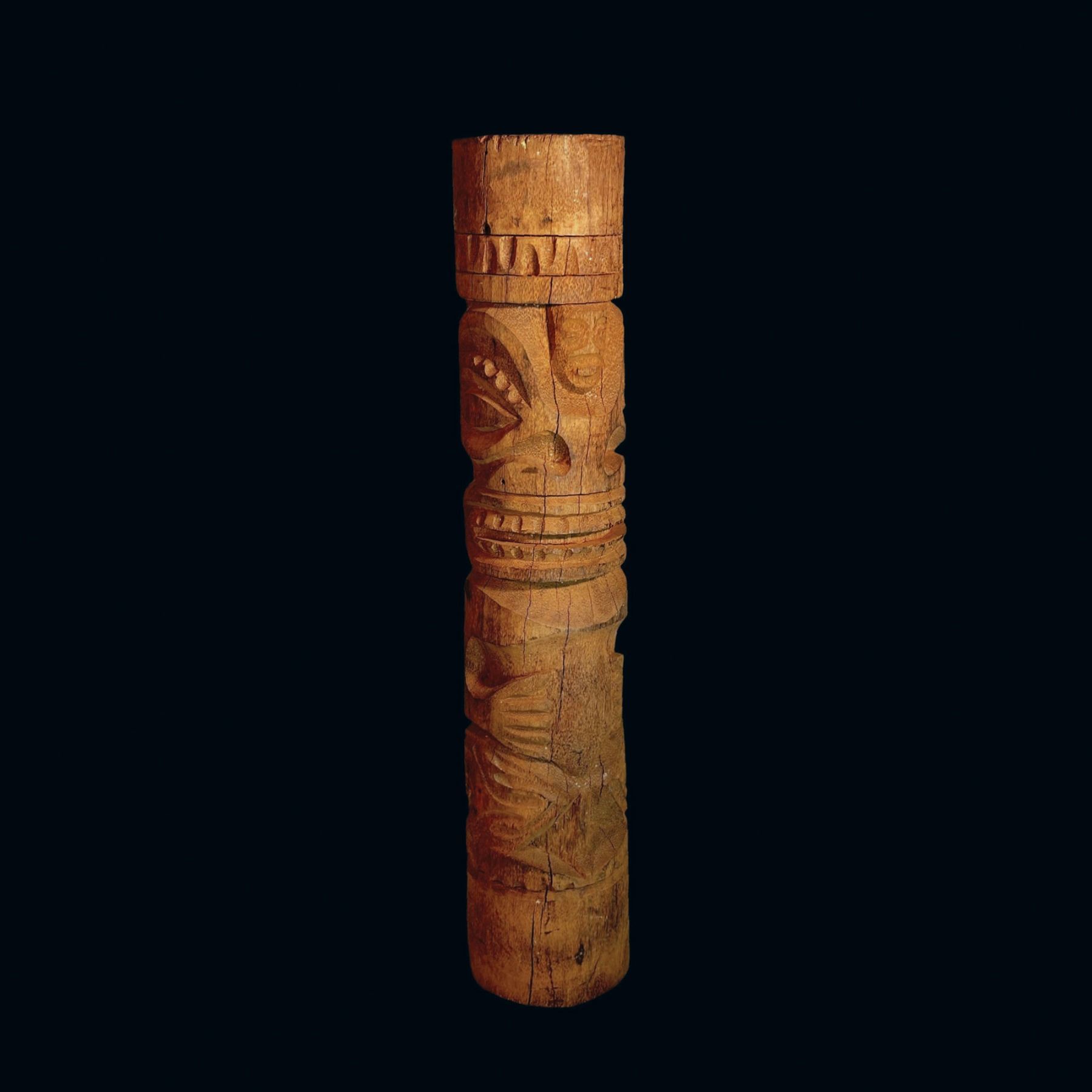 (1950s) A knock-dead gorgeous Tahitian pole carving salvaged from use at the world famous MAI-KAI in Fort Lauderdale, Florida. Removed during the early 1960s renovations by George Nakashima. This very solid and heavy carving was most probably acquired by the Thorntons from either Schmaltz-Van Oosting or Cargoes By Carter. VG+. 9.5"dia x 49".