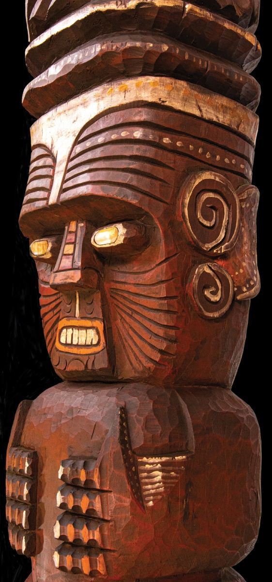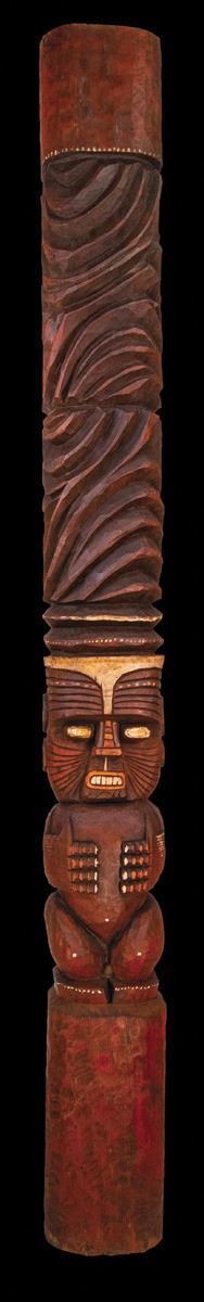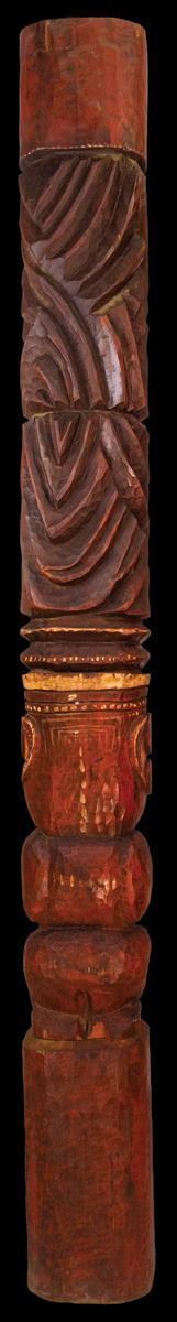 (1960s) A true stunner of tiki! This large figural column post was an architectural element made for Yue's LAHANI ALOHA in Redondo Beach, CA. This was Helen and Cheeda Yue's expansion project at the beach. Carved by Ed Crissman with powerfully graphic detail. A central Maori warrior tiki dominates the column and it features shell inlay eyes. The piece features its original paint scheme with excellent vintage patina. A most impressive carving at almost 10 feet in height. This figure is large and will require special shipping arrangements.118"x12"x11".VG+ with typical wear.