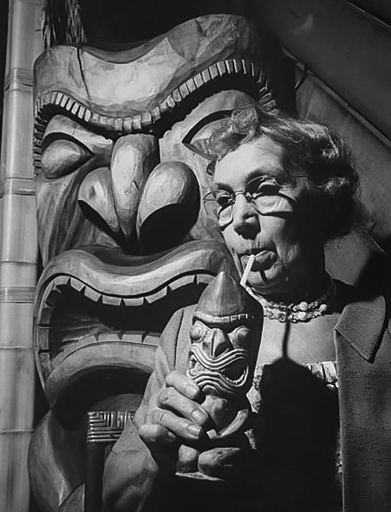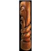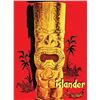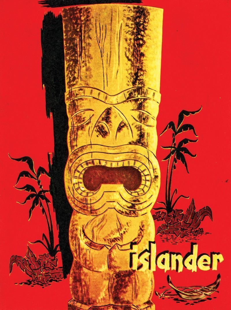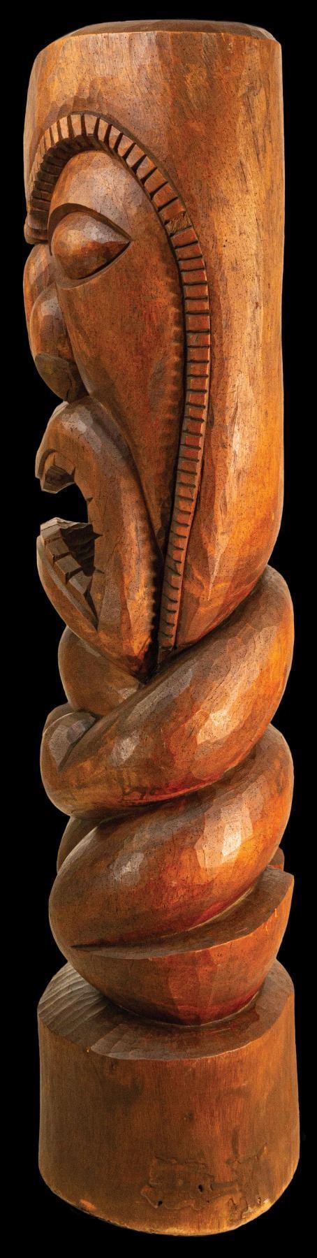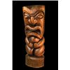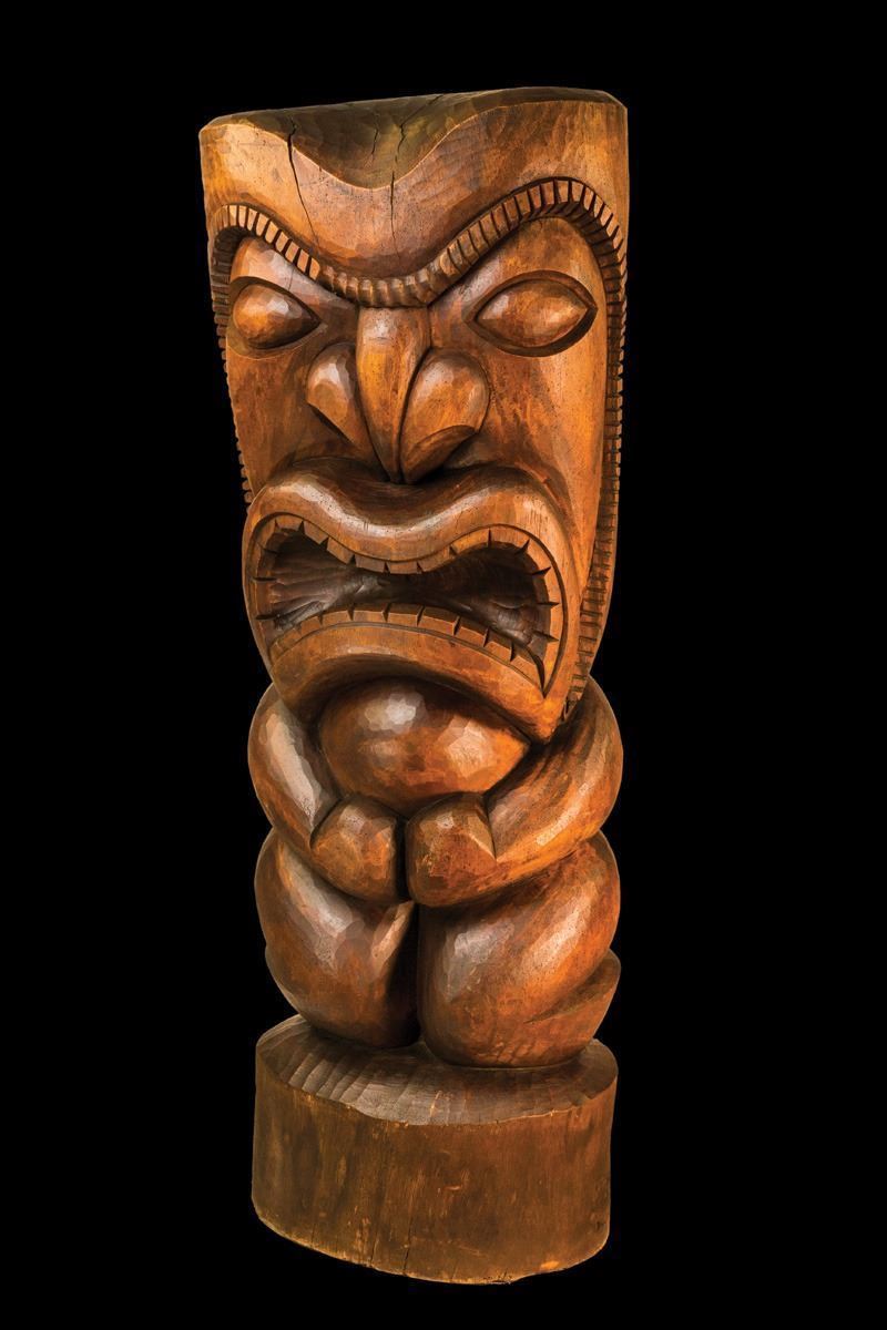 (1960s) A show-stopping artifact from the Poly-Pop Tiki Era. This carving was on display at the famous La Cienega Blvd. location of THE ISLANDER in Los Angeles. It was supplied to the venue by Oceanic Arts and created by famed carver, Demetrio Chavez. According to LeRoy, the wood itself is anomaly: It was carved from a highly uncommon oval tree log. This probably occurred when the tree grew between two hard rock surfaces. This accounts for the distinctive shape of the tiki. From Leroy's perspective, unusual shaped logs such as this are especially coveted and saved for only exceptional projects. "Big Smiley" (as Bob has referred to the tiki for many years) was even featured in an issue of LIFE magazine for an article on the Tiki Craze of the period. When The Islander closed, OA purchased back some of the decor and it has greeted visitors to the OA showroom for decades. It's size and quality of carving is exceptional as well as its rich leathery patina. One of the true jewels of the OA collection and a noteworthy piece of Tiki history! Heavy and will require special shipping arrangements.64"x24"x15".VG+ with typical wear.