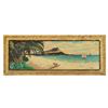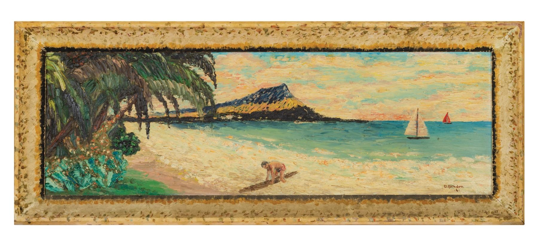 (1950s) An oil on canvas impressionistic painting of a surfer reaching the shore on the beach with Diamondhead off in the distance. Signed by 'D. Bender 6'. Period wood frame also textured with dabbed paint strokes that match the art, most probably done by the artist as a dimensional accent. 40"x16". VG+.