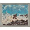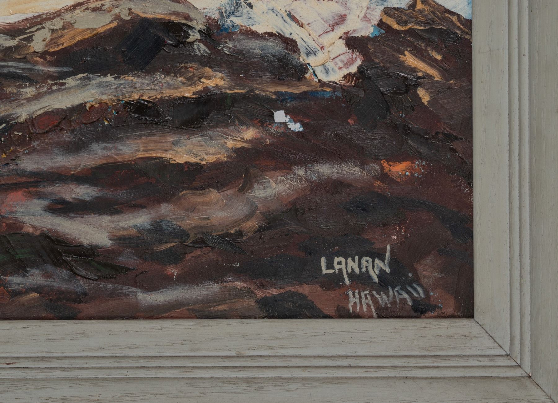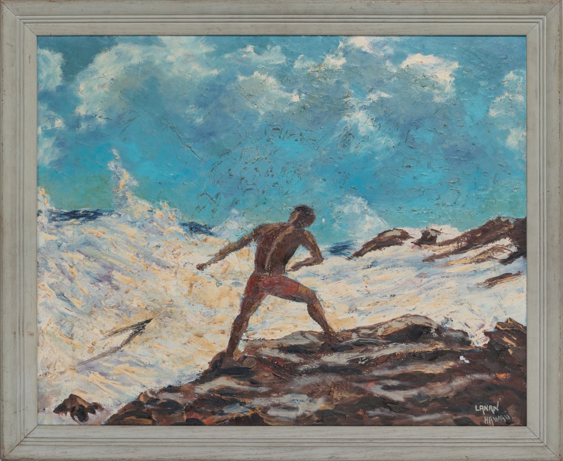 (1950s) Magnificent power of the crashing surf waves highlight this oil on wood painting of a native male atop a rocky outcropping facing the elements. Solid beveled wood frame. Signed by artist. "LAHAN - HAWAII" Quintessential Hawaiiana. 33.75"x27.75". VG+ with some paint chipping in a 1" area.