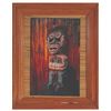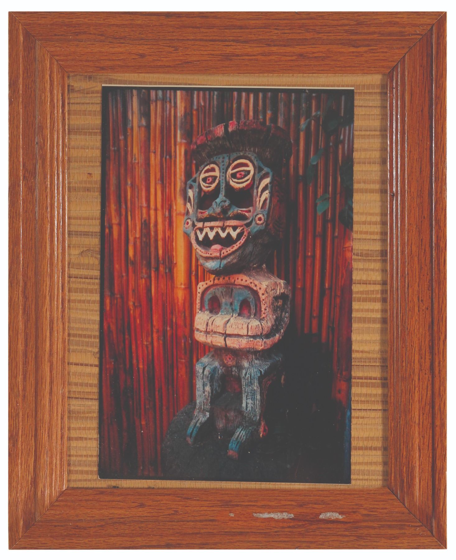 (1990s) Framed original Walt Disney Imagineering reference photo of Tiki goddess KORO. Full body photograph of a carved Tiki idol allows the viewer to notice the vivid hand-painted colors indicative of authentic native imagery. Wooden frame with thatched bamboo grass matting. Hung in the offices at WDI. Dug Miller Collection. Frame:10.5"x12.5" Picture:6"x9". VG+