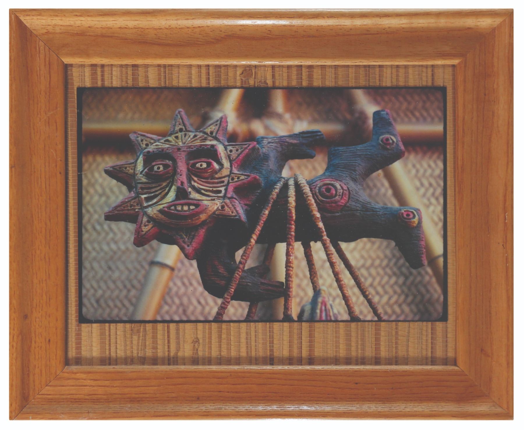 (1990s) Framed original Walt Disney Imagineering reference photo of Tiki goddess MAUI. Stunning glossy photographic image of a hand-carved Sun God Tiki idol captures the bold and imaginative use of colors to create a captivating work of art. Wood frame with thatched bamboo grass matting. Frame:12.5"x10.5" Picture:9"x6". VG+