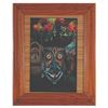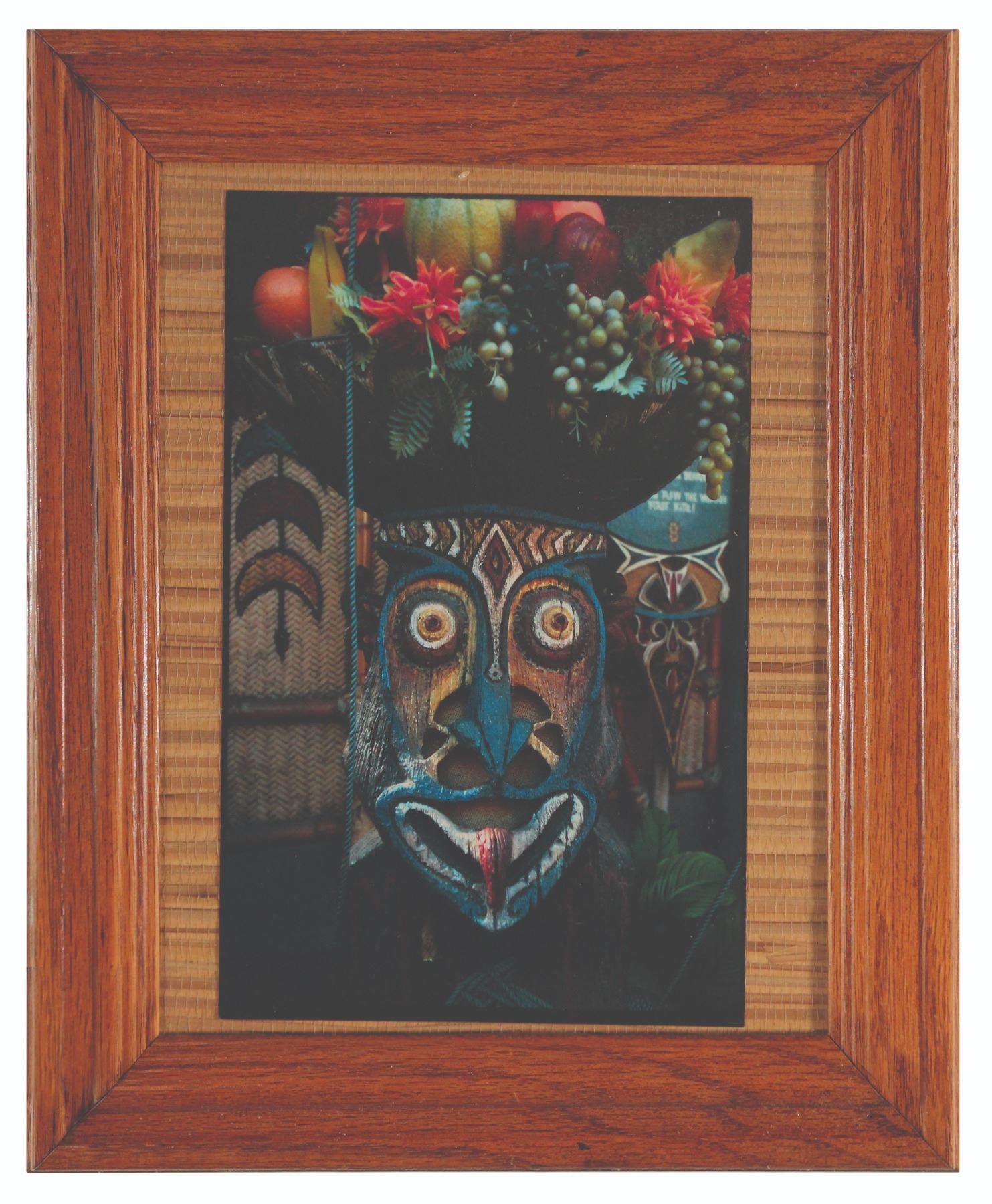 (1990s) Framed original Walt Disney Imagineering reference photo of Tiki goddess RONGO. This photographic image of a hand-carved Tiki gof features and unusual bowl of fruit placed on his head. Wooden frame with bamboo grass thatched matting. Hung in the offices at WDI. Dug Miller Collection. Frame:10.5"x12.5" Picture 6"x9". VG+