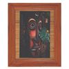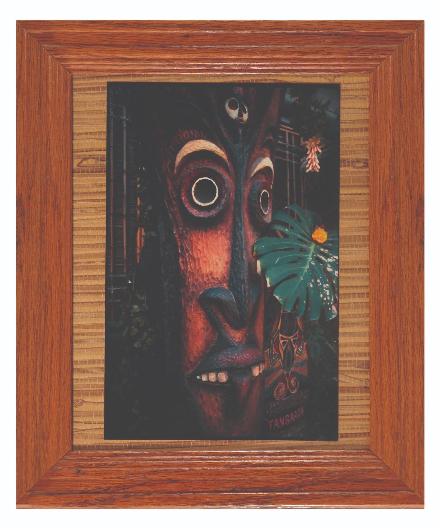 (1990s) Framed original Walt Disney Imagineering reference photo of Tiki goddess TANGAROA. Image of dual Tiki idols features the striking craftsmanship of pitted wood carving to create depth to the item. Additional smaller Tiki reads "Tangaroa" on the base. Wood frame with thatched bamboo grass matting. Hung in the offices at WDI. Dug Miller Collection. Frame:10.5"x12.5" Picture:6"x9". VG+