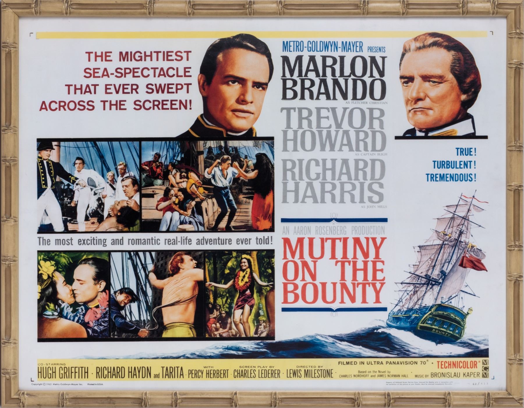 (1962). Reprint half sheet poster of the MGM film "Mutiny on the Bounty" starring Marlon Brando, Trevor Howard, and Richard Harris. Features five still images of the film and illustrated image of the Bounty ship on right border. Paper poster with glass and wood bamboo frame. 30"x23.5". VG+.