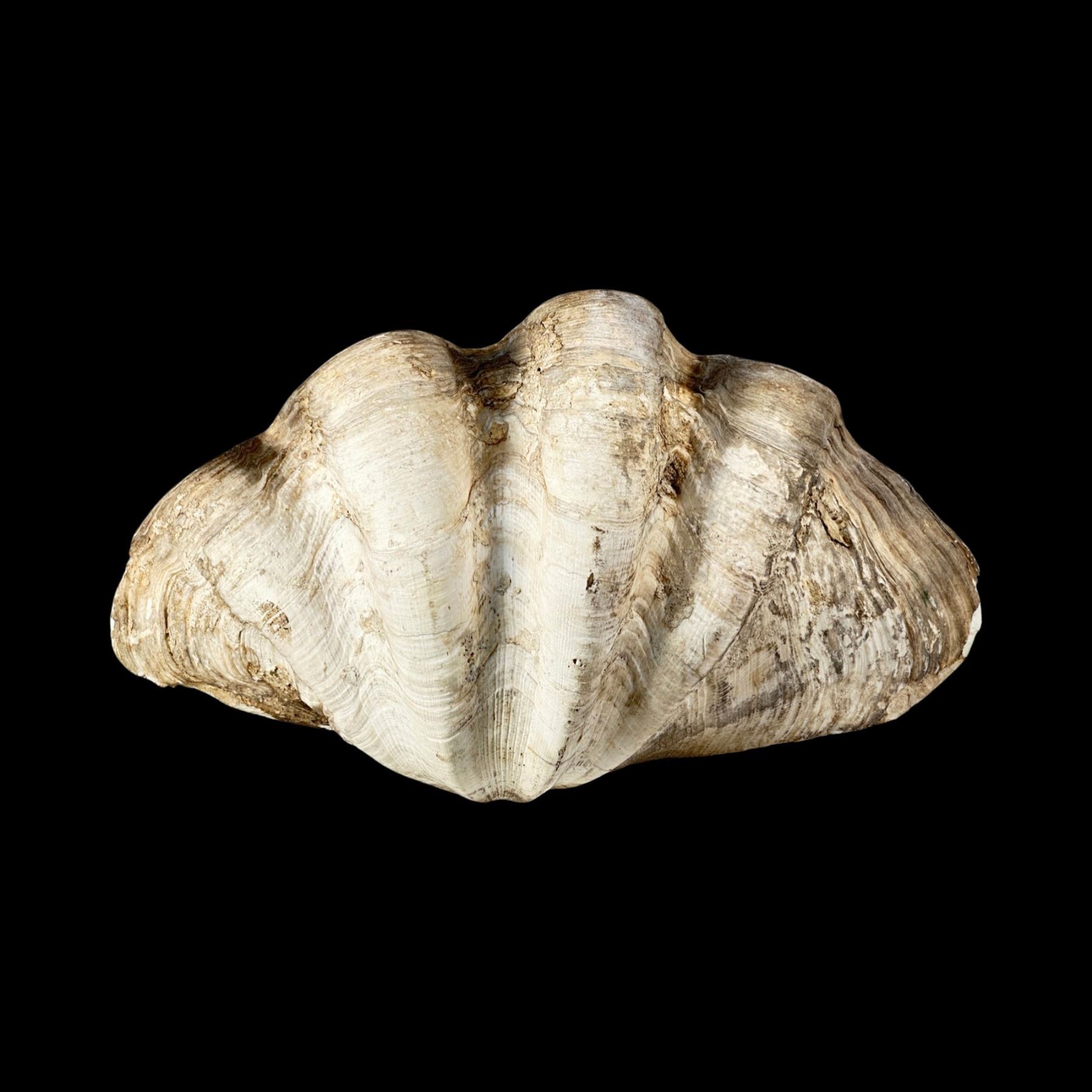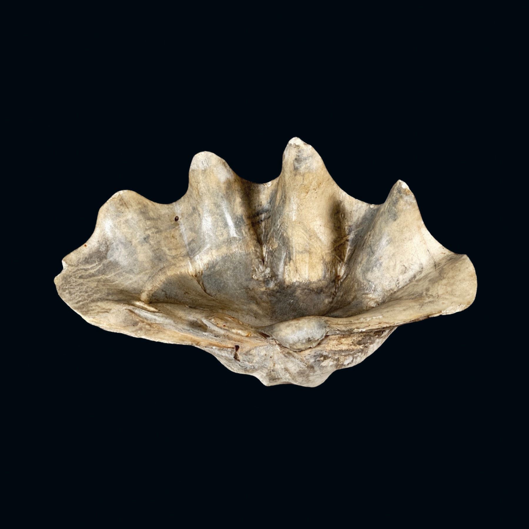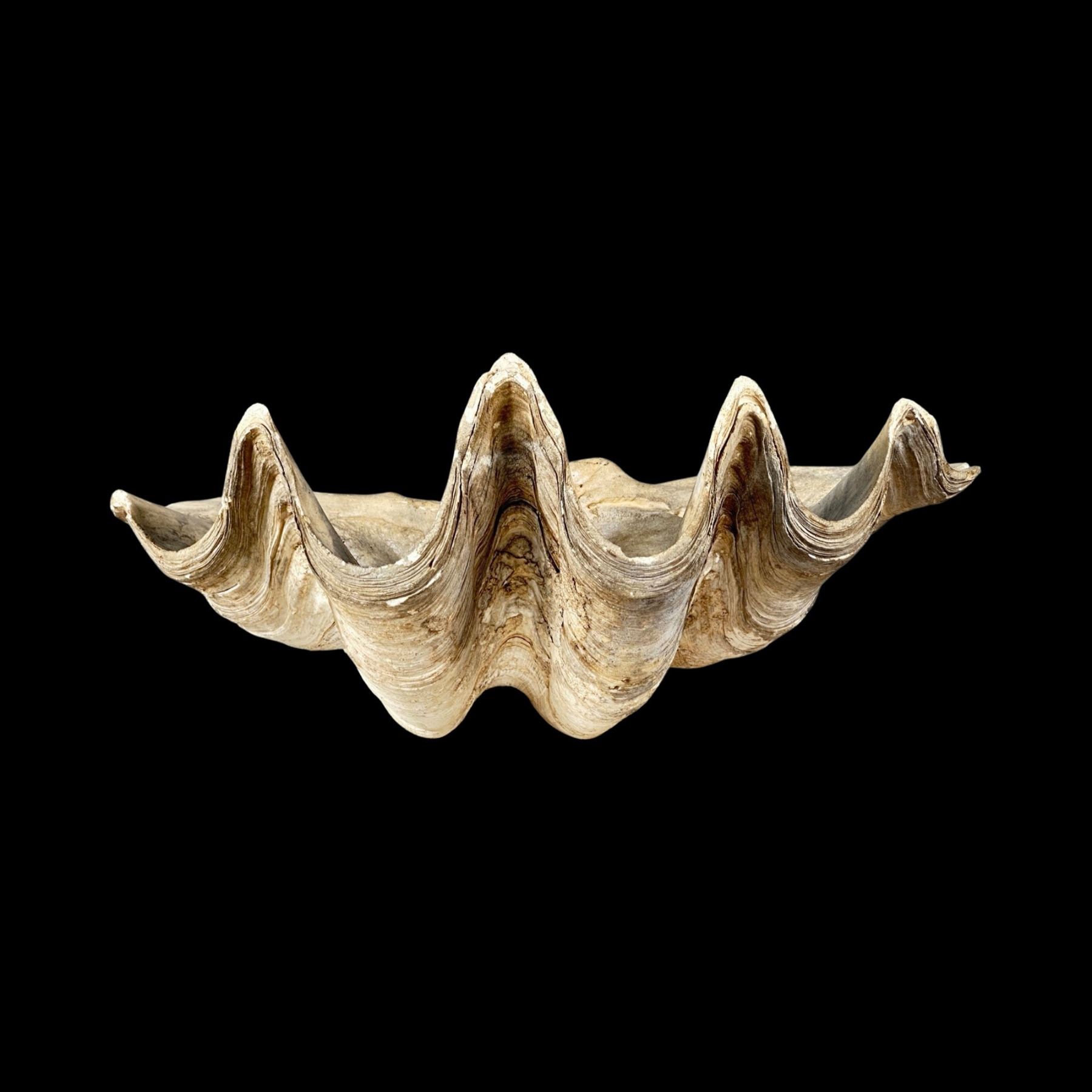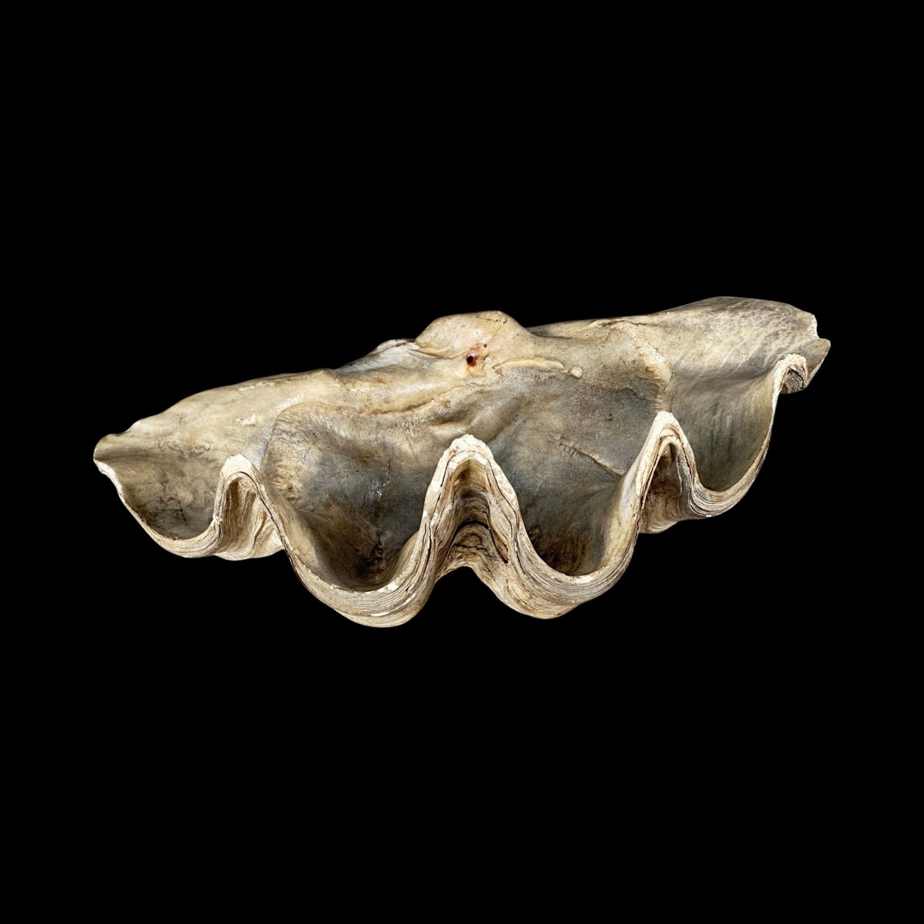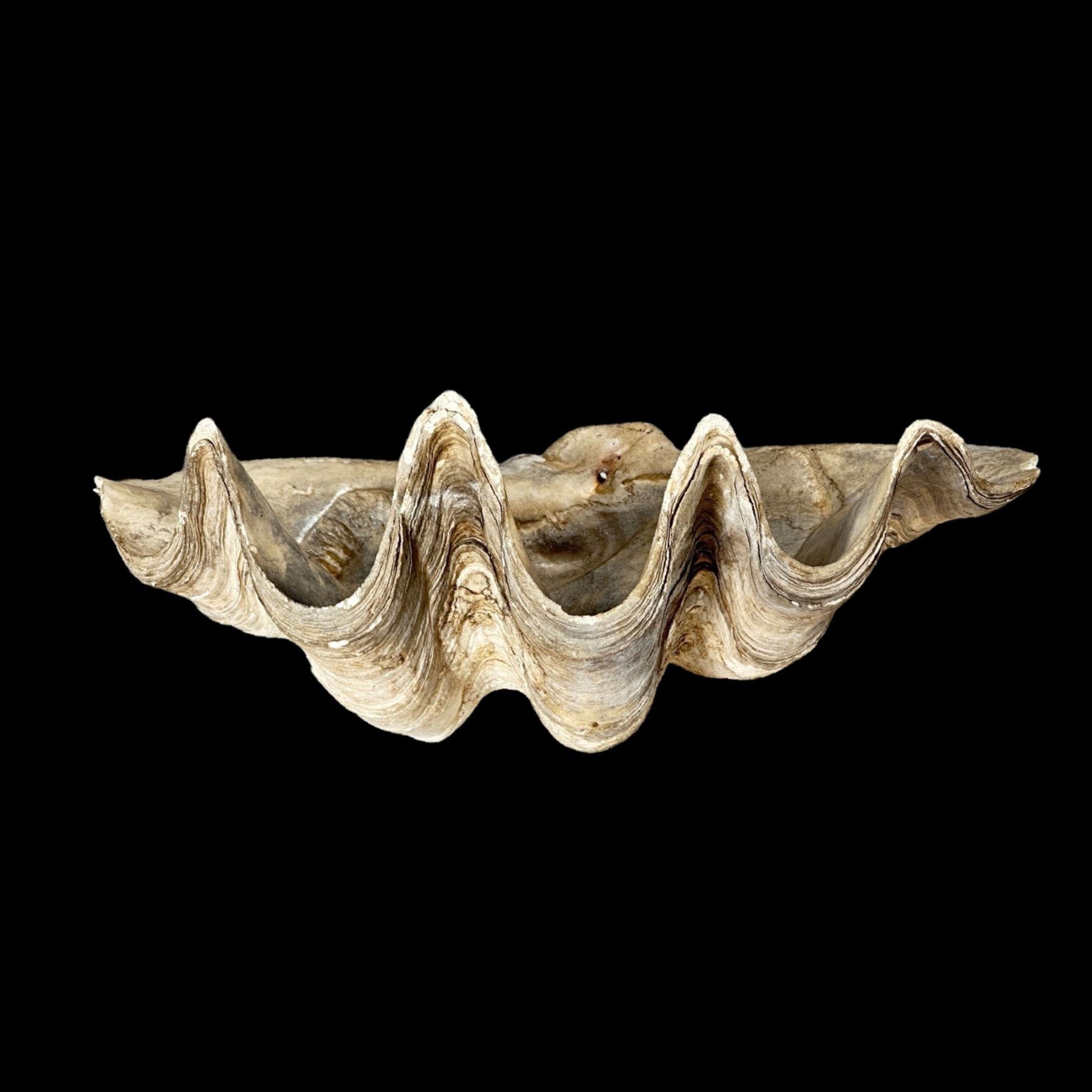 (1950s) There was a time when Oceanic Arts was importing the ultra scarce tradacna giant clam shells in by the container. A main element of commercial Polynesian decor back in the Golden Age, these are extremely rare to find now as their harvesting is strictly regulated. One of the last from the OA warehouse samples. VG+ with typical wear and chipping. Heavy. 15.25"x7"x8".
